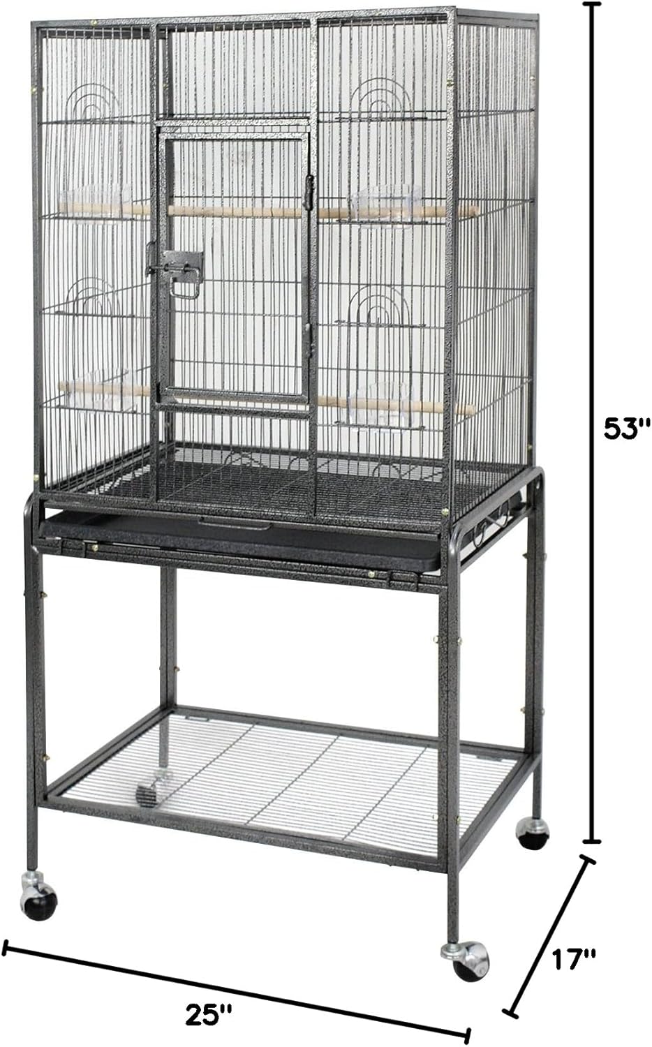 Looking for a bird cage for Conures, Pionus, Jardine’s Parrot, Caciques, Poicephalus, Red-bellied and other small to medium sized bird? Try Saicool 53 –inch Wrought Iron Construction Large Standing Bird Cage! Feature: - Solid strong metal frame for years' use- highest-quality wrought iron- With 4 caster wheels at the bottom- 2 perches, 3 feeder doors with locks and 4 food cups- A slide-out plastic tray covered with waterproof paint- Easy to assemble, include all necessary accessoriesSpecifications: - Material: Iron- Color: Black- Size: 25"(W) X 17"(D) X 53"(H) - Overall Height Including Stand: 53" - Bar Spacing: 1/2'' - Hight Without The Stand:30.7'' Package Includes: - 1 x Cage Main Frame- 1 x Cage stand - 1 x ABS Plastics Trays - 2 x Wooden Perches - 4 x Swivel casters- 4 x Plastic Bowls