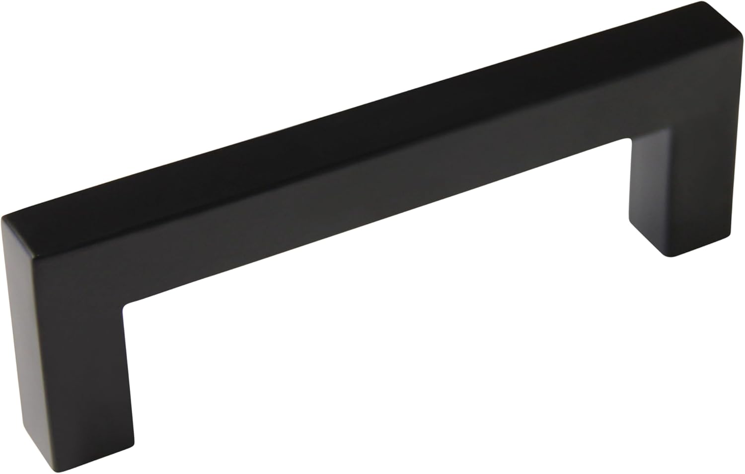 This modern square bar pull has a sleek, minimalist design with crisp right angles and a black finish. The design draws from Bauhaus and European modernism and gives cabinets and furniture a clean, industrial accent suited to contemporary and transitional interiors. The handle is made from durable hollow stainless steel and has a light yet sturdy feel. Each pull comes with matching screws for easy installation. The smooth black coated finish resists fingerprints and corrosion and pairs well with light or dark cabinetry.